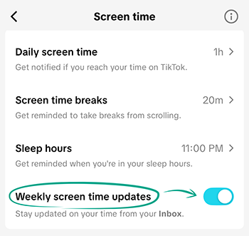 Note: You will receive a weekly notification with your statistics in your TikTok Inbox. You can check your TikTok screen time statistics at any time in Screen time.