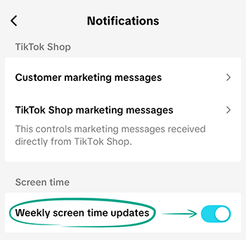 - Under Screen time, toggle on Weekly screen time updates.