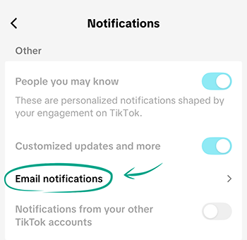 - Other, including People you may know, Customized updates and more, and Notifications from your other TikTok accounts.