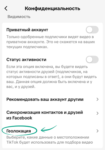TikTok может использовать данные о вашем местоположении для персонализации рекламы и рекомендаций видео. Если вы не хотите передавать данные геолокации, вы можете отключить эту настройку и удалить их. Чтобы отключить геолокацию: