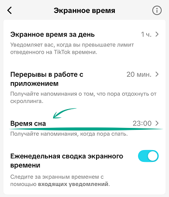 Режим сна помогает сократить использование TikTok в ночное время. Функция отключает звук push-уведомлений и напоминает вам о том, что пора завершить просмотр видео.