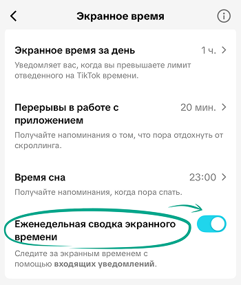 - В подразделе Экранное время включите опцию Еженедельная сводка экранного времени.