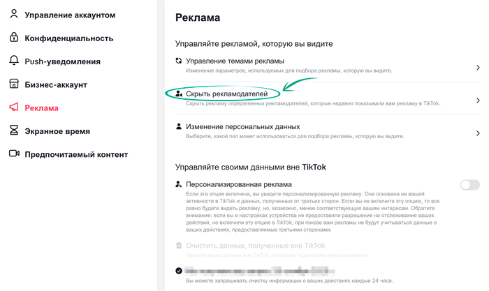 - Чтобы удалить уже собранные данные о вашей активности, в разделе Реклама нажмите Очистить данные, полученные вне TikTok.
