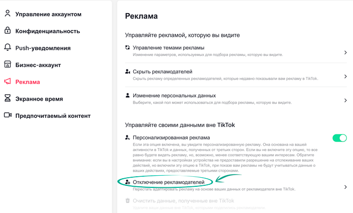 - Отключите опцию Персонализированная реклама. Этим действием вы также отключите сбор приложением TikTok данных от сторонних сервисов и рекламодателей.
