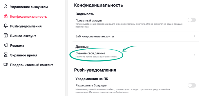 TikTok собирает и хранит много информации о вас. В приложении есть данные, которые вы указывали в профиле, информация о вашей активности (например, лайки и история покупок), а также все настройки. Если аккаунт украдут или заблокируют, данные будут потеряны. Чтобы этого не произошло, можно запросить у TikTok архив ваших данных и скачать его на телефон или компьютер. Вот как это сделать:
