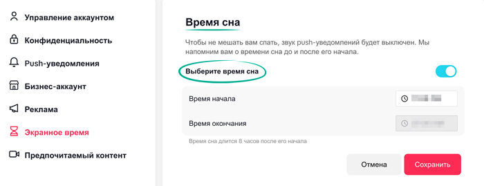Режим сна помогает сократить использование TikTok в ночное время. Функция отключает звук push-уведомлений и напоминает вам о том, что пора завершить просмотр видео.