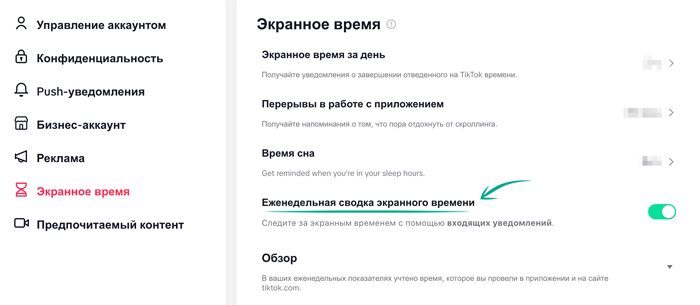 Обратите внимание: вы будете получать еженедельное уведомление со статистикой во Входящих уведомлениях TikTok. Статистику своего экранного времени в TikTok вы можете посмотреть в любой момент в разделе настроек Экранное время, нажав на Обзор.