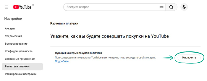 По умолчанию при совершении покупок YouTube запрашивает пароль. Однако функция быстрых покупок позволяет проводить платежи без подтверждения. Если вы хотите предотвратить случайные траты и защитить свои деньги, рекомендуем не отказываться от подтверждения транзакций. Чтобы отключить функцию быстрых покупок: