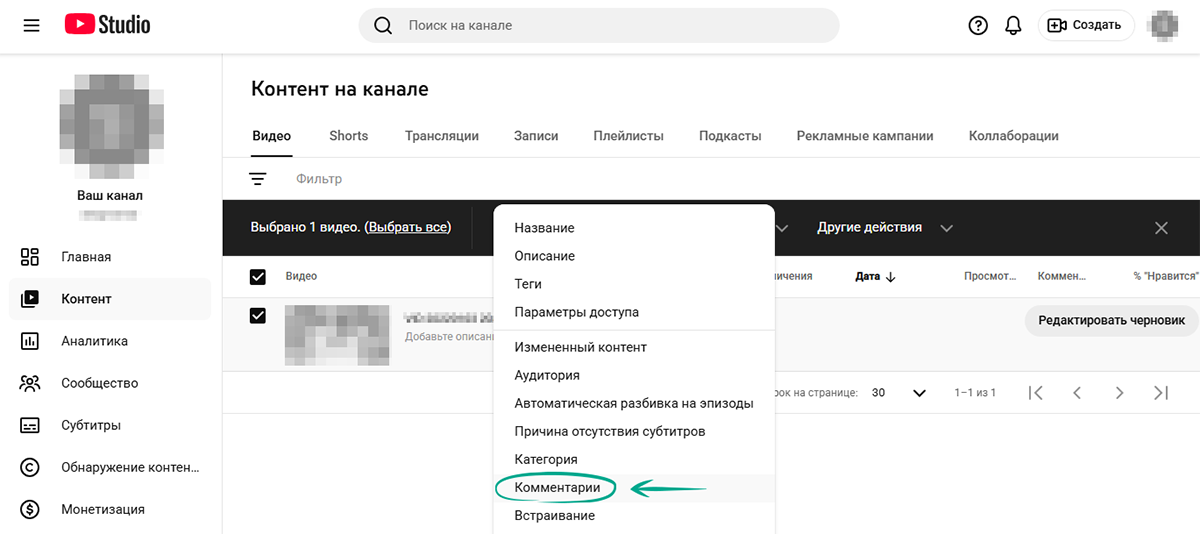- В выпадающем меню Изменить над списком видео нажмите Комментарии.