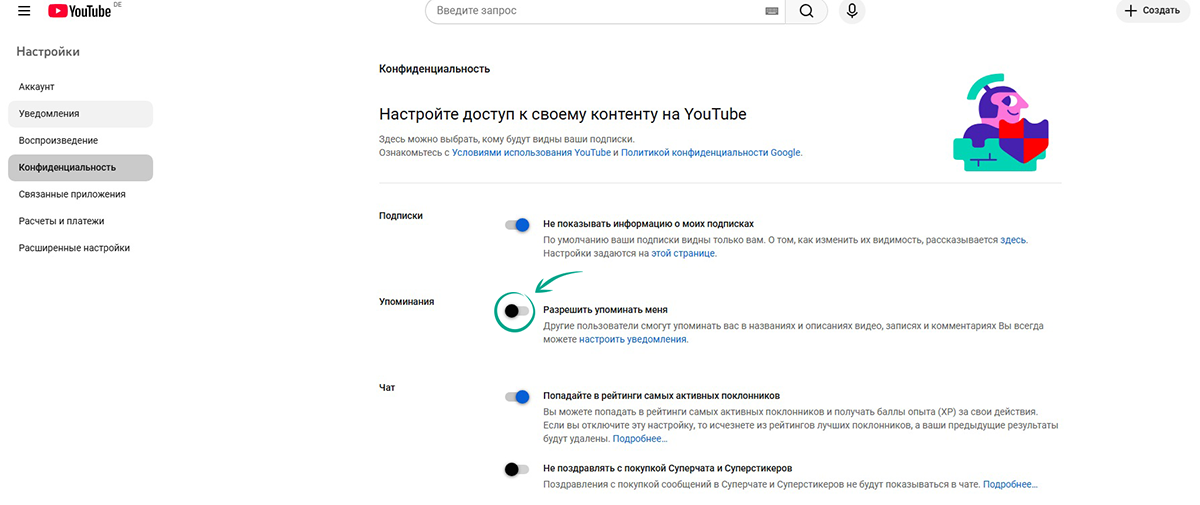 Другие пользователи YouTube могут упоминать имя вашего профиля со ссылкой на него в своих публикациях, названиях и описаниях видео, записях и комментариях. Чтобы это не произошло в неприемлемом для вас контексте, запретите упоминания: