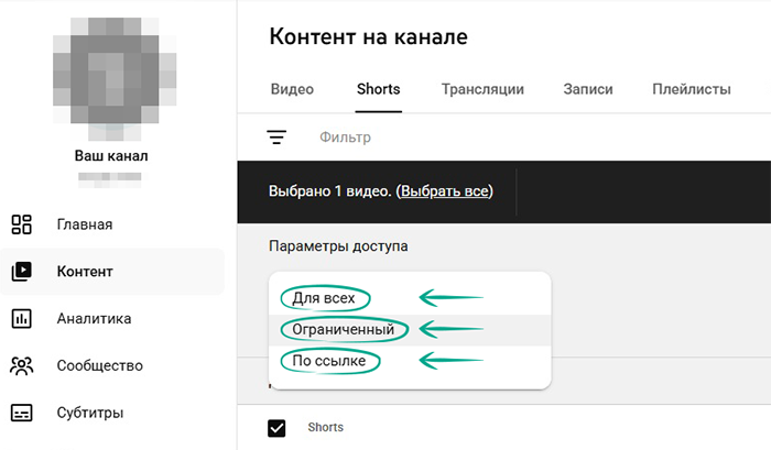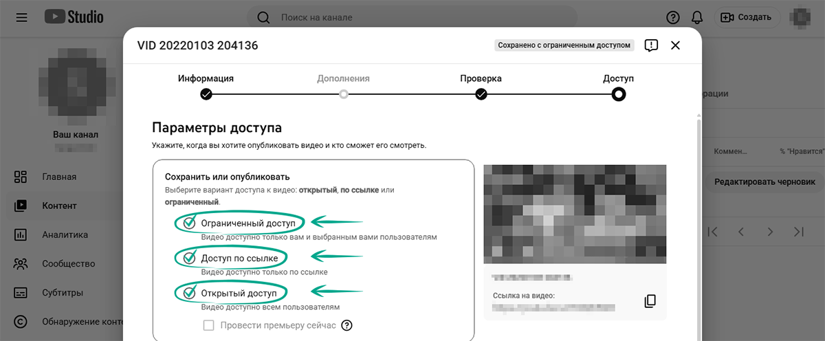 - Доступ по ссылке – видео смогут видеть только те люди, у которых есть ссылка на него