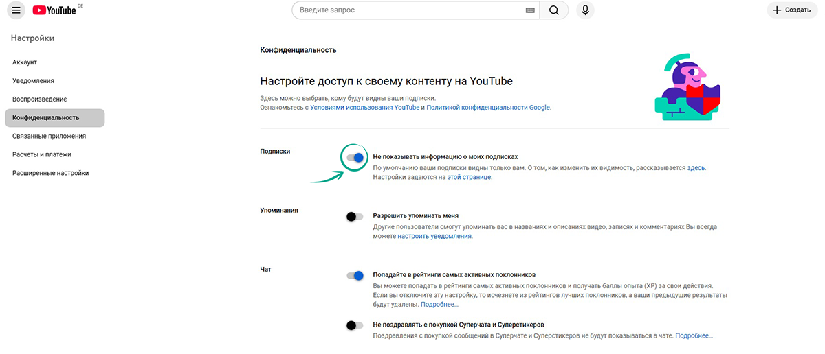 На странице вашего профиля YouTube есть информация о подписках. Если вы не хотите, чтобы другие пользователи видели эти данные, доступ к ним можно закрыть. Для этого: