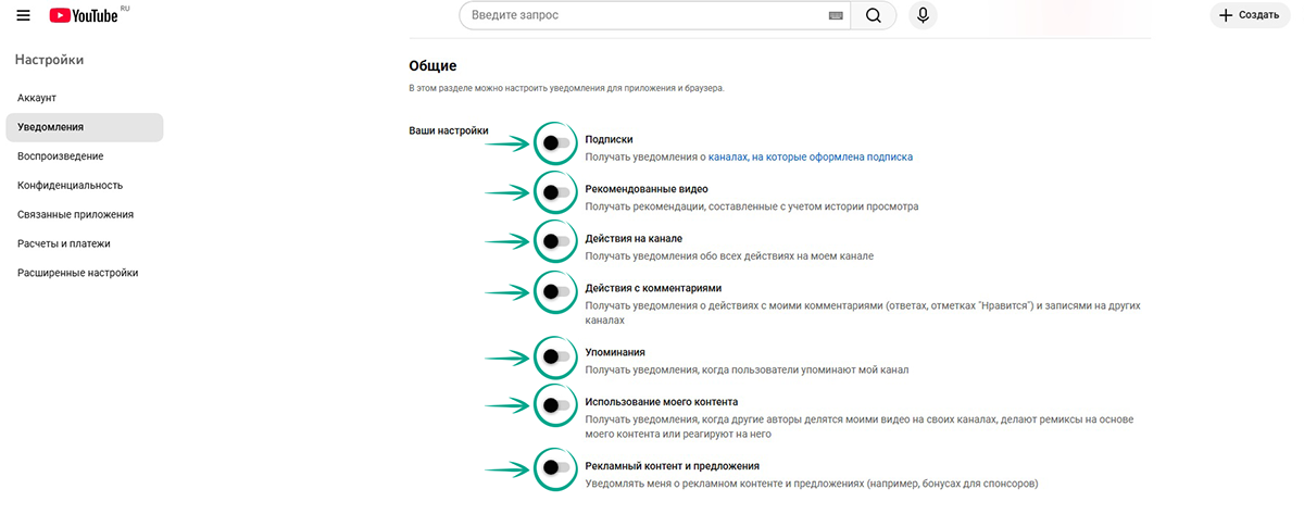 - В разделе Общее отключите ненужные уведомления для приложения и браузера: